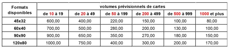 Voici les tarifs 2023 selon les formats et les quantités  :
